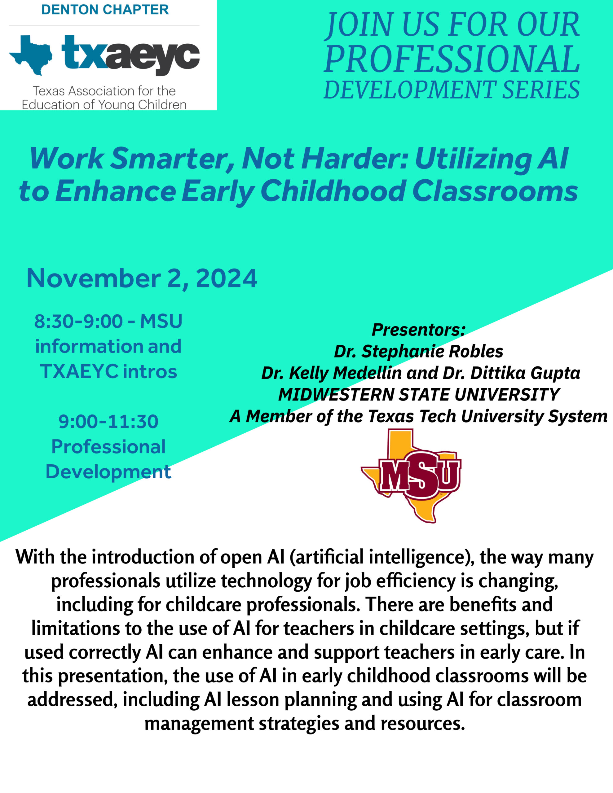 Professional Development Series: Work Smarter, Not Harder: Utilizing AI to Enhance Early Childhood Classrooms Registration is at 8:30am, and the...